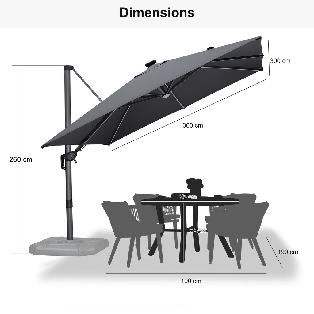 [ LED Design ] This patio umbrella is equipped with luxury LED lights, and the LED light design powered by the top solar panel makes your outdoor life more convenient and fun.