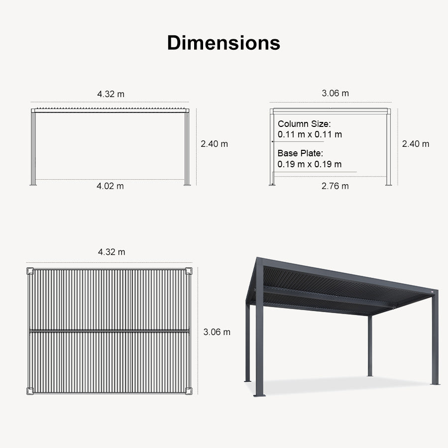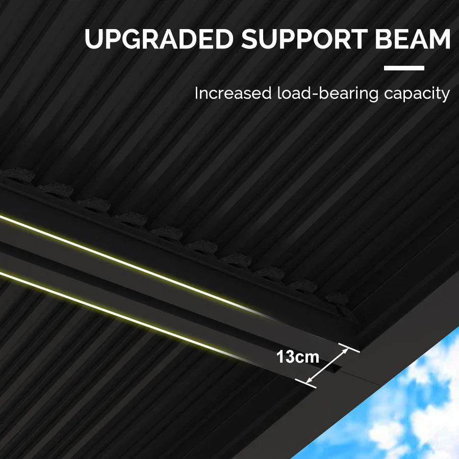 · Independent Adjustable Aluminum Louvered Roof: Designed with independent adjustable roofs, equipped with adjustable poles that allow you to adjust it effortlessly from 0° to 90°, offering multiple protection options against sun, rain, and wind.