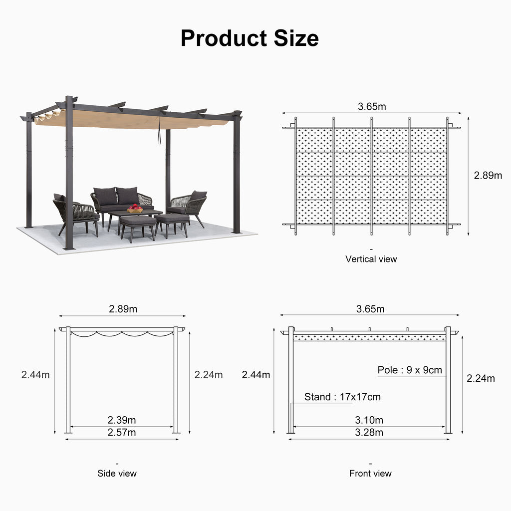 [ Sturdy and Durable ] Wind rating: 48km/h. Our metal pergolas are built to last with heavy duty-extruded aluminum coated with a powder coat finish. The pergolas are engineered from the ground up to add strength while providing 4 pre-drilled holes on each pillar that can fix any kind of floor.